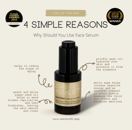Special organic facial oils are used to complement the skin. Award winning Zone Face Lift Facial Elixir contains many ingredients such as the peach oil, coconut oil, macadamia oil, geranium oil white poppy seed and more to complement and visibly improve skin condition.